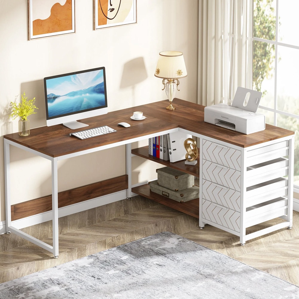 L-formet skrivebord med 4 skuffer og 2 hyller – Hvit/valnøtt