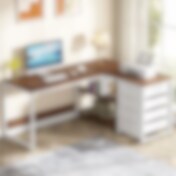 L-formet skrivebord med 4 skuffer og 2 hyller - Hvit/Walnut / Hjørneskrivebord med oppbevaring og skuffer