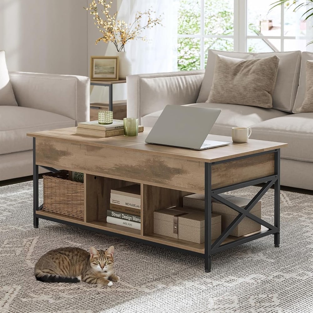 Sofabord med heveplate og åpen/skjult oppbevaring, 60 x 100 x (48-62) cm - Rustikk brun / svart