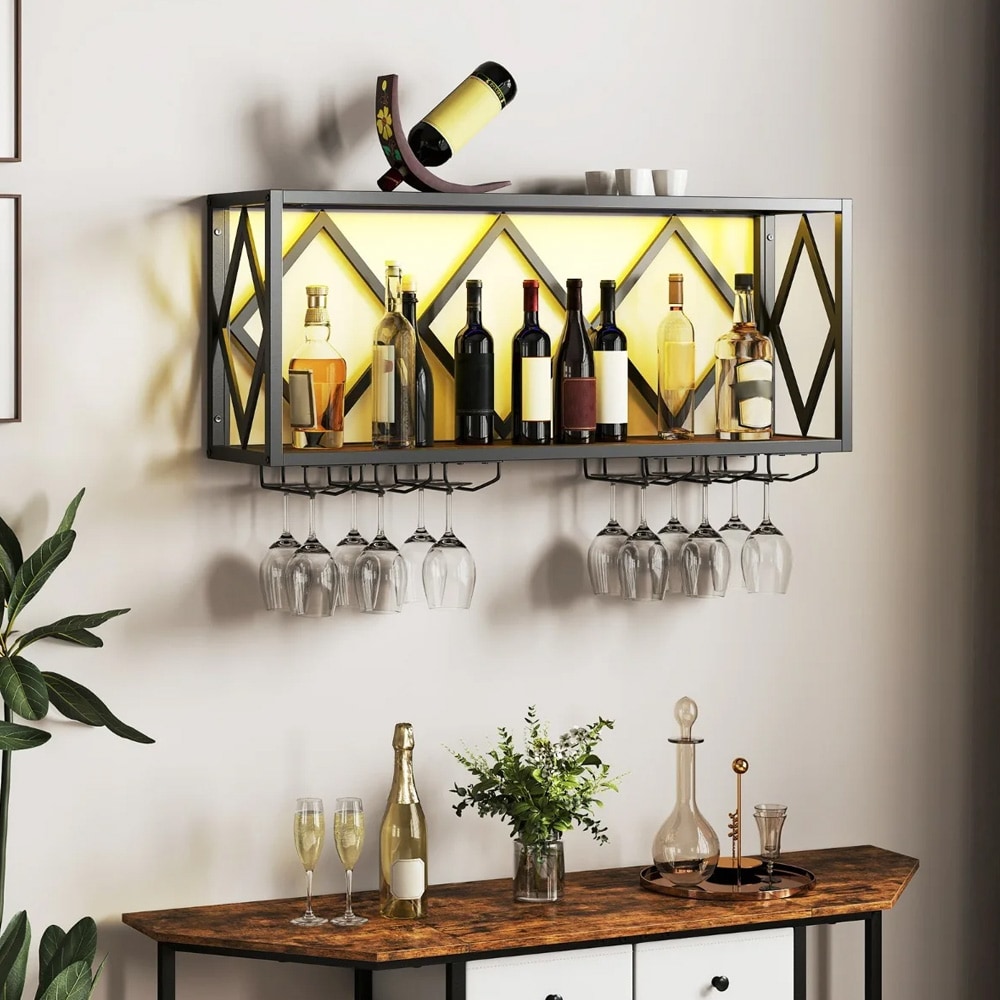 Veggmontert vinhylle med glassholder og LED-belysning