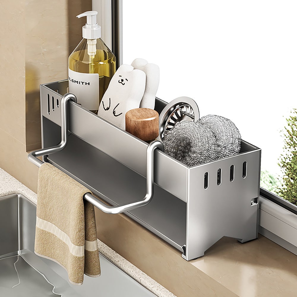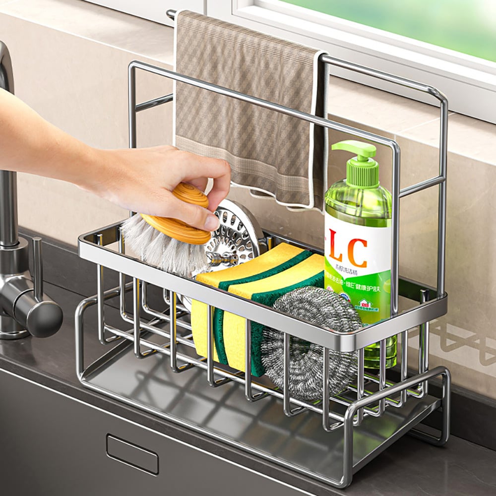 Hylle i rustfritt stål for oppvaskbørste, vaskemiddel og svamp