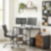 Dataskrivebord i svart med bokhylle, flyttbar hylle og romslig arbeidsflate