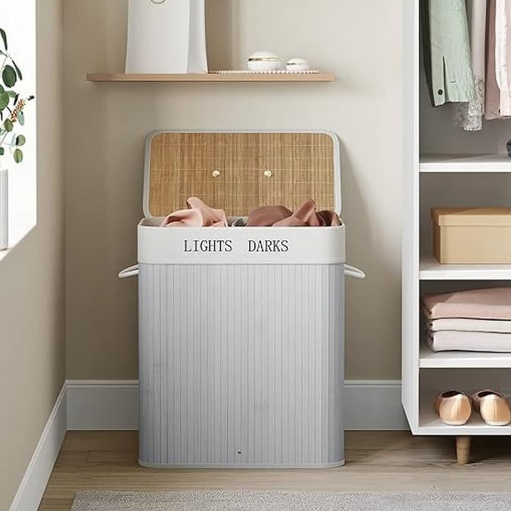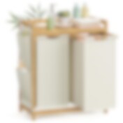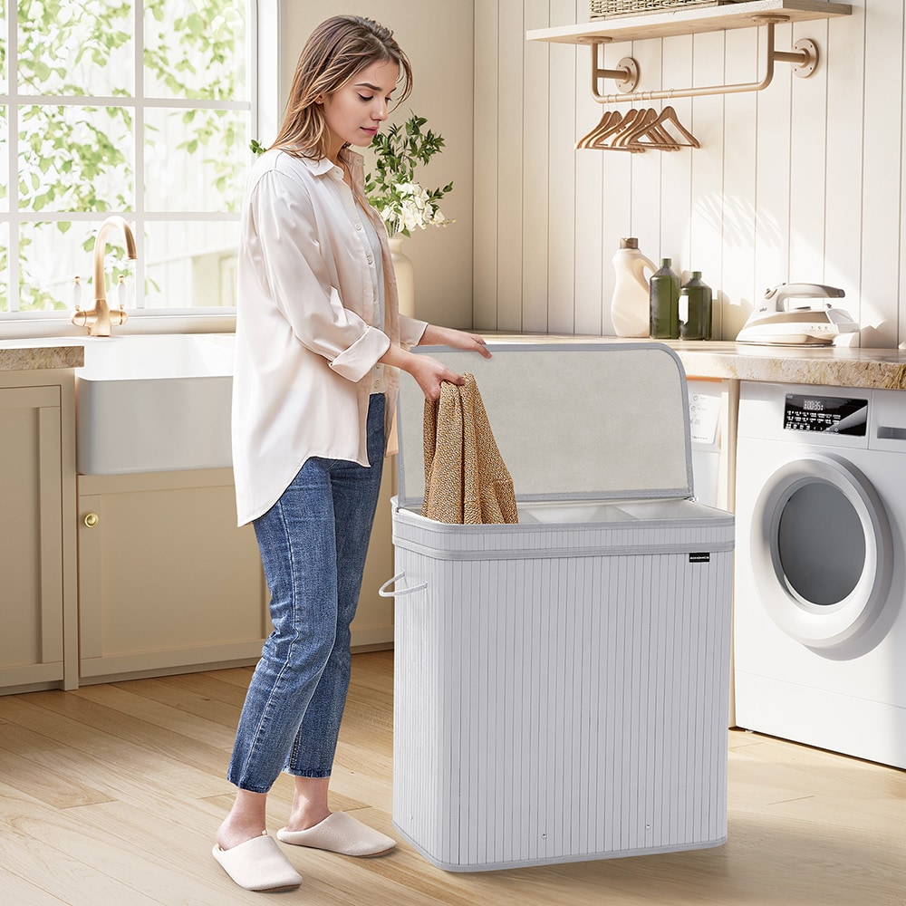 Klesvaskkurv i bambus med 2 rom og lokk 100L - Hvit