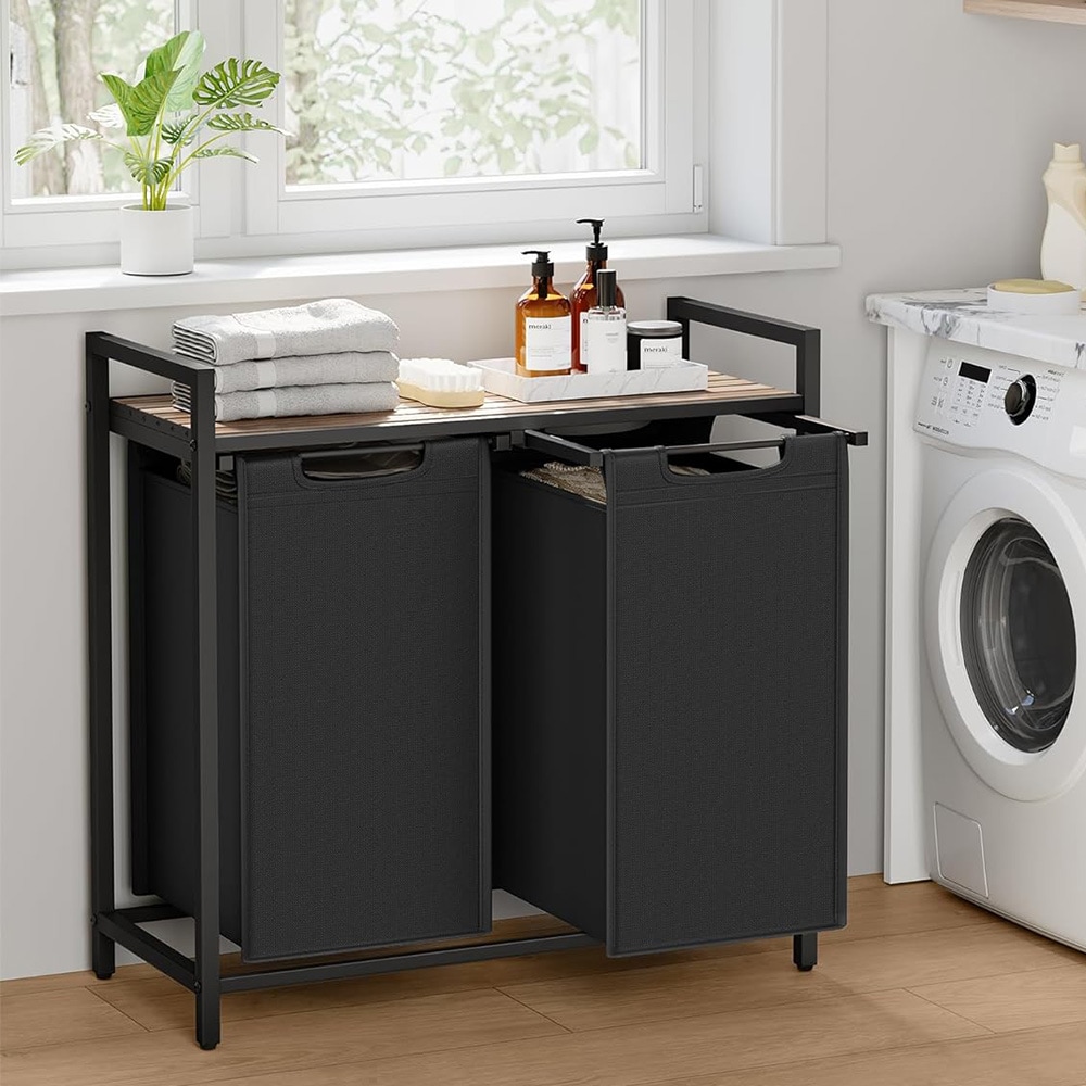 Klesvaskkurv med 2 uttrekkbare og avtakbare skittentøyposer 2x46L - Svart