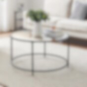 Rundt salongbord med glassplate og svart stålramme