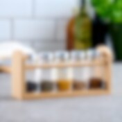 Krydderstativ i bambus med 5 glassbeholdere og aluminiumslokk